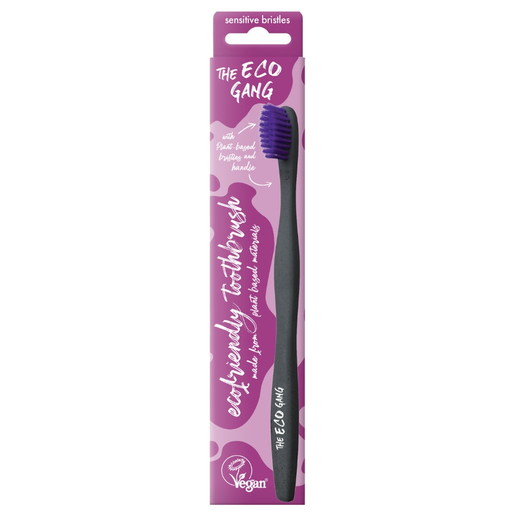 The Eco Gang plant-based toothbrush has a handle made out of a mix of wheat starch and PP. The bristles are made of high-quality nylon-6 bristles. The packaging is eco-friendly, the box and inside wrapper are made from recyclable materials, and can be thrown out with organic trash.