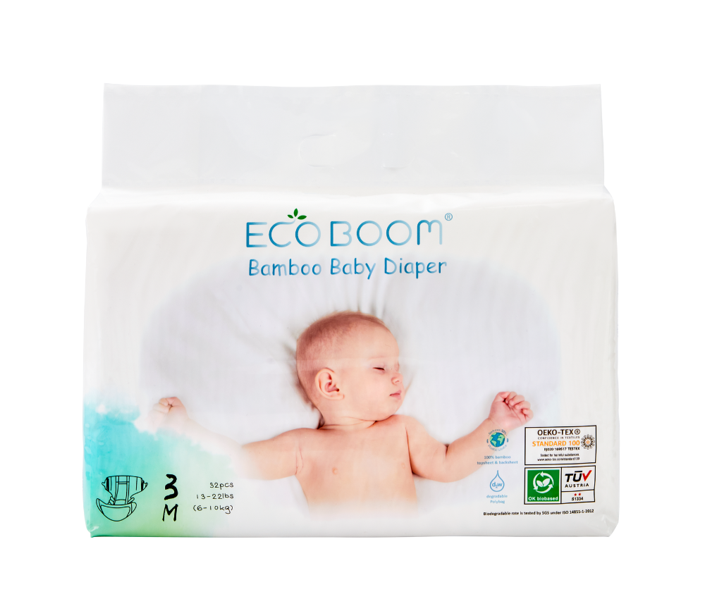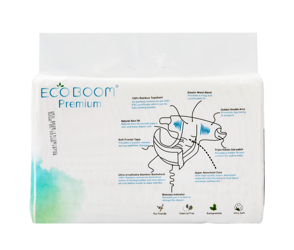 Premium disposable nappy made with 100% biodegradable bamboo fiber topsheet & backsheet.