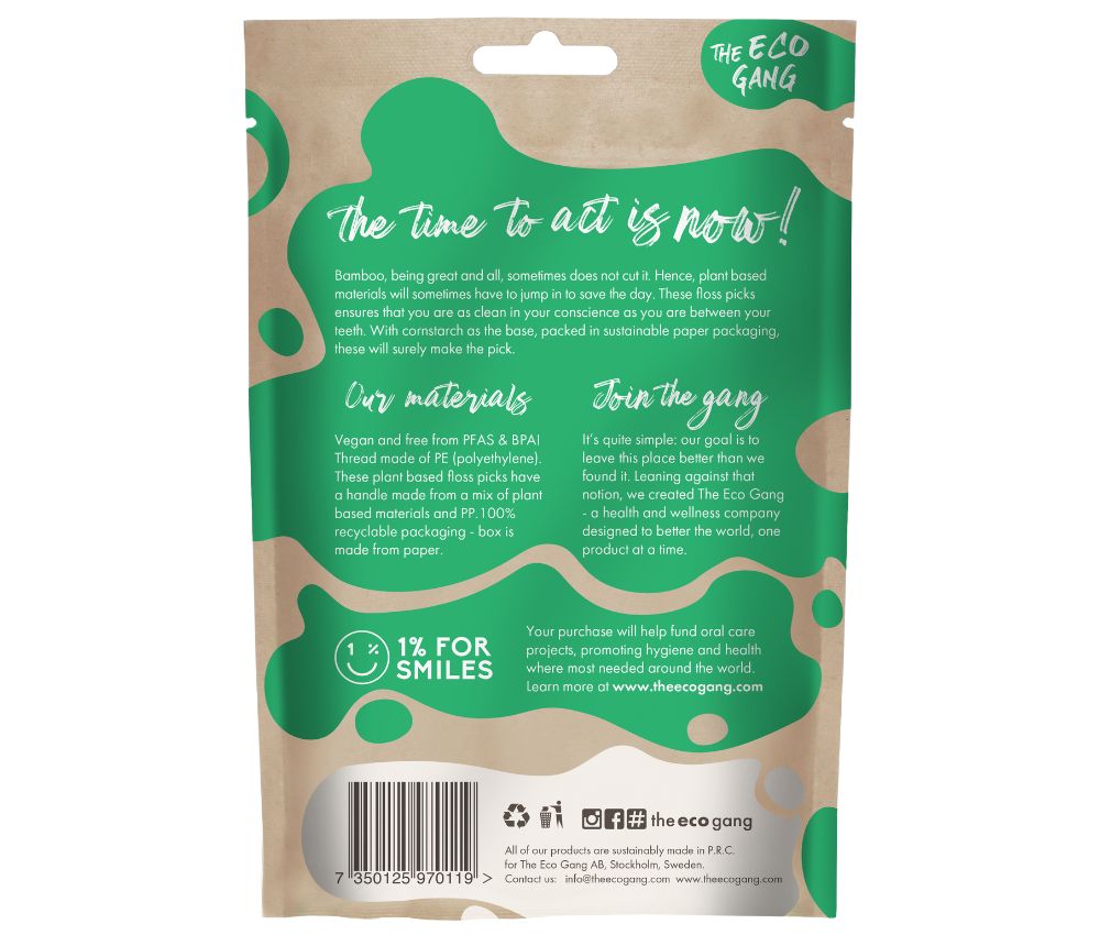 These floss picks ensure a proper clean and good conscience. The double threading ensures that food debris is effectively removed while the shape of the pick promotes easy access to those hard-to-reach places. With cornstarch as the base, packed in sustainable paper packaging, these will surely make the pick.
