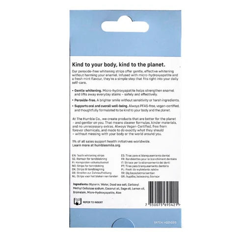 The Humble Co. Whitening Strips are made with natural ingredients and a peroxide-free, non-abrasive formula that protects enamel and gently whitens teeth. They are performance-tested for visible whitening, certified by The Vegan Society, and free from forever chemicals.